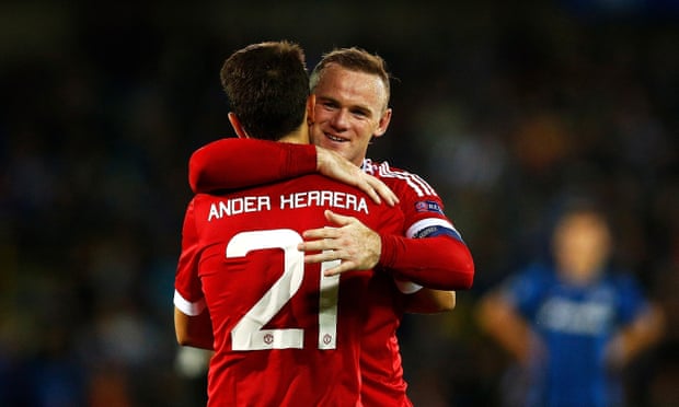 Manchester United’s Wayne Rooney and Ander Herrera celebrate another goal in the 4-1 win against Club Brugge. Photograph: Dean Mouhtaropoulos/Getty Images
