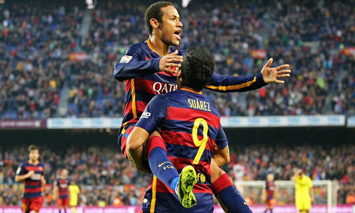 Facebook Twitter Pinterest The tridente celebrate a goal against Atlético Madrid in January 2015. Photograph: Albert Gea/Reuters