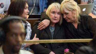 Image copyrightAFPImage captionReeva Steenkamp's mother June (centre) was in court for the rulingMs Steenkamp's mother, June, was present and afterwards she was seen outside the court being embraced by members of the African National Congress Women's League, who were singing songs of celebration.