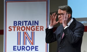 Peter Mandelson giving a speech for the Britain Stronger In Europe campaign in March 2016. Photograph: Ben Pruchnie/Getty Images“Or was there something deeper – did he simply not want to find himself on the same side as the prime minister and the government? Or perhaps he just, deep down, actually doesn’t think we should remain in the European Union? Who knows?”