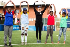 Charlize Theron with with young participants of one of her project’s grantees, WhizzKids United. Photograph: Leigh Page